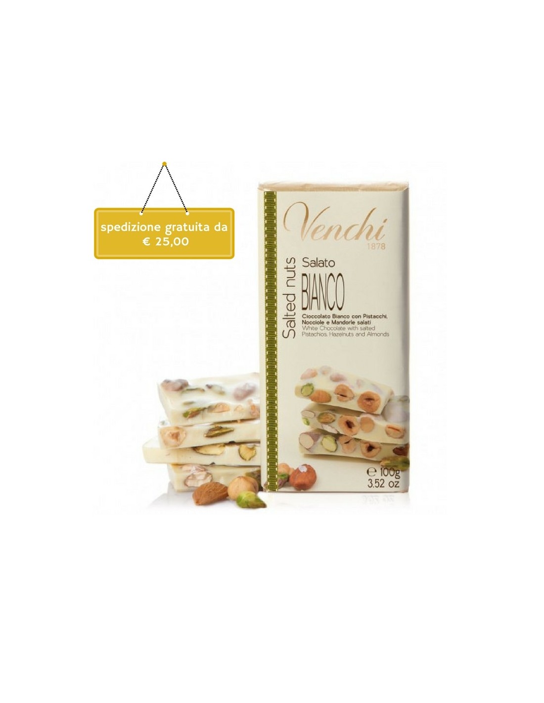 Tavoletta di cioccolato bianco con mandorle, pistacchi e nocciole leggermente salati.